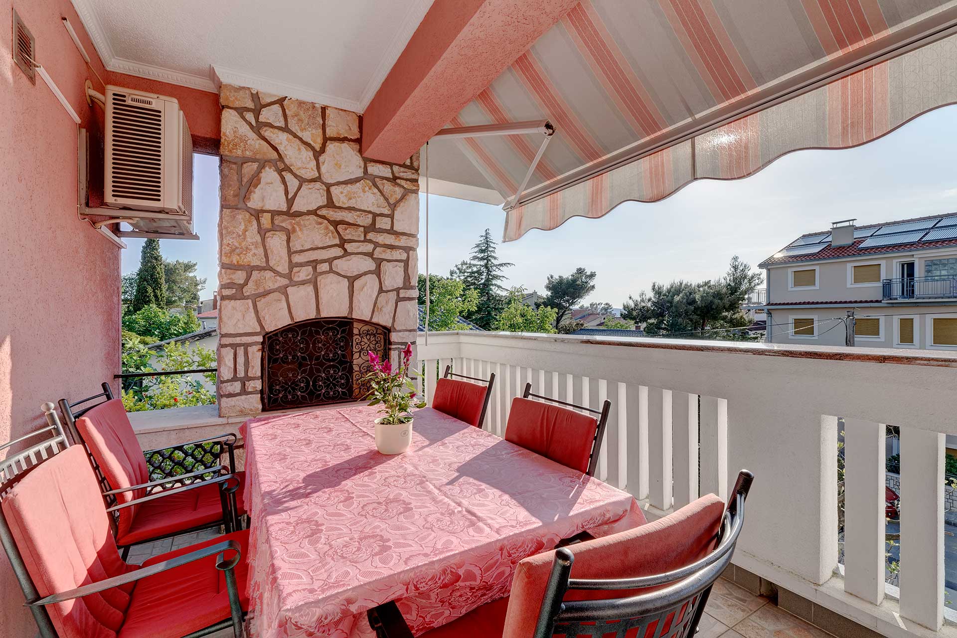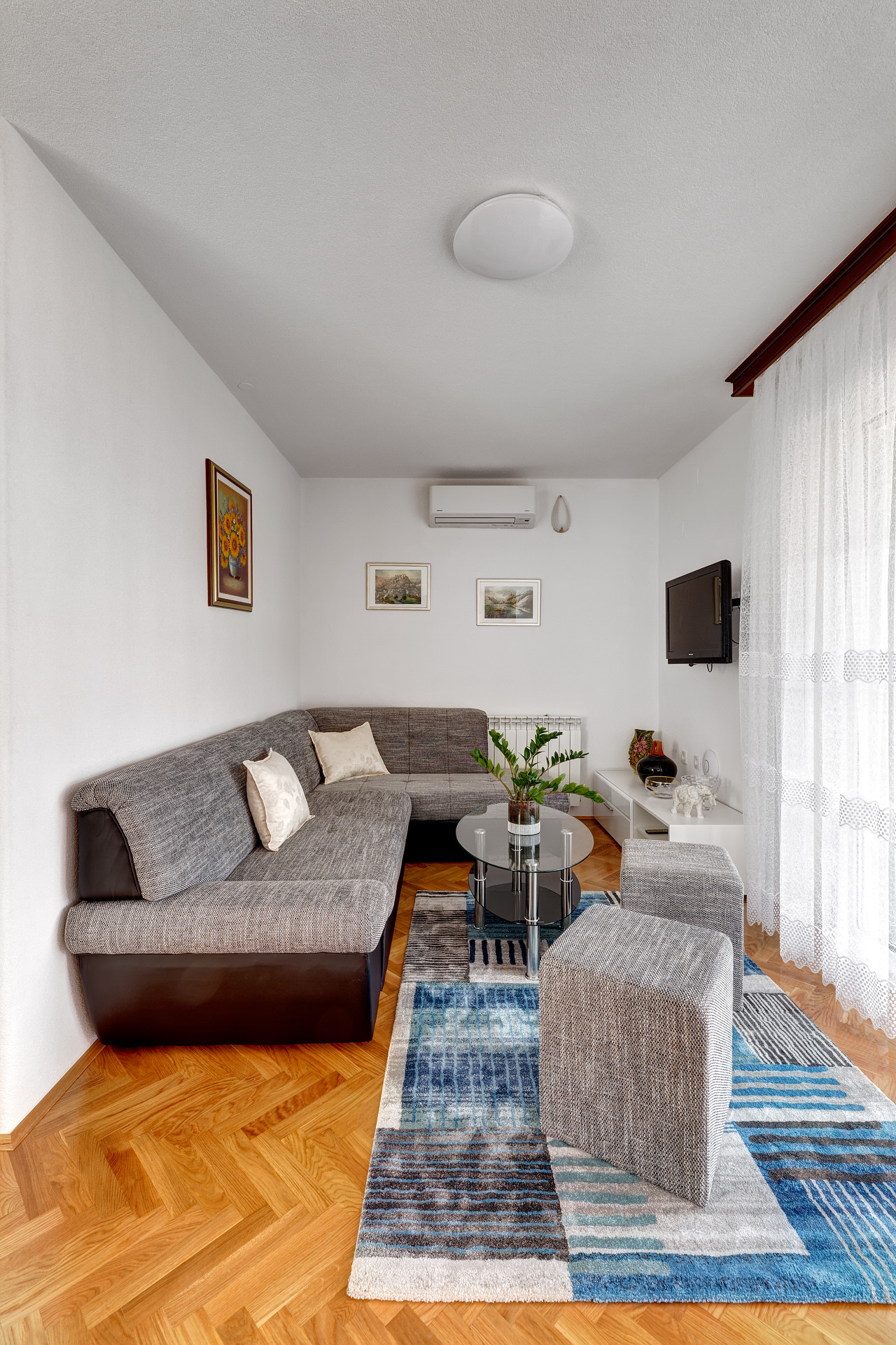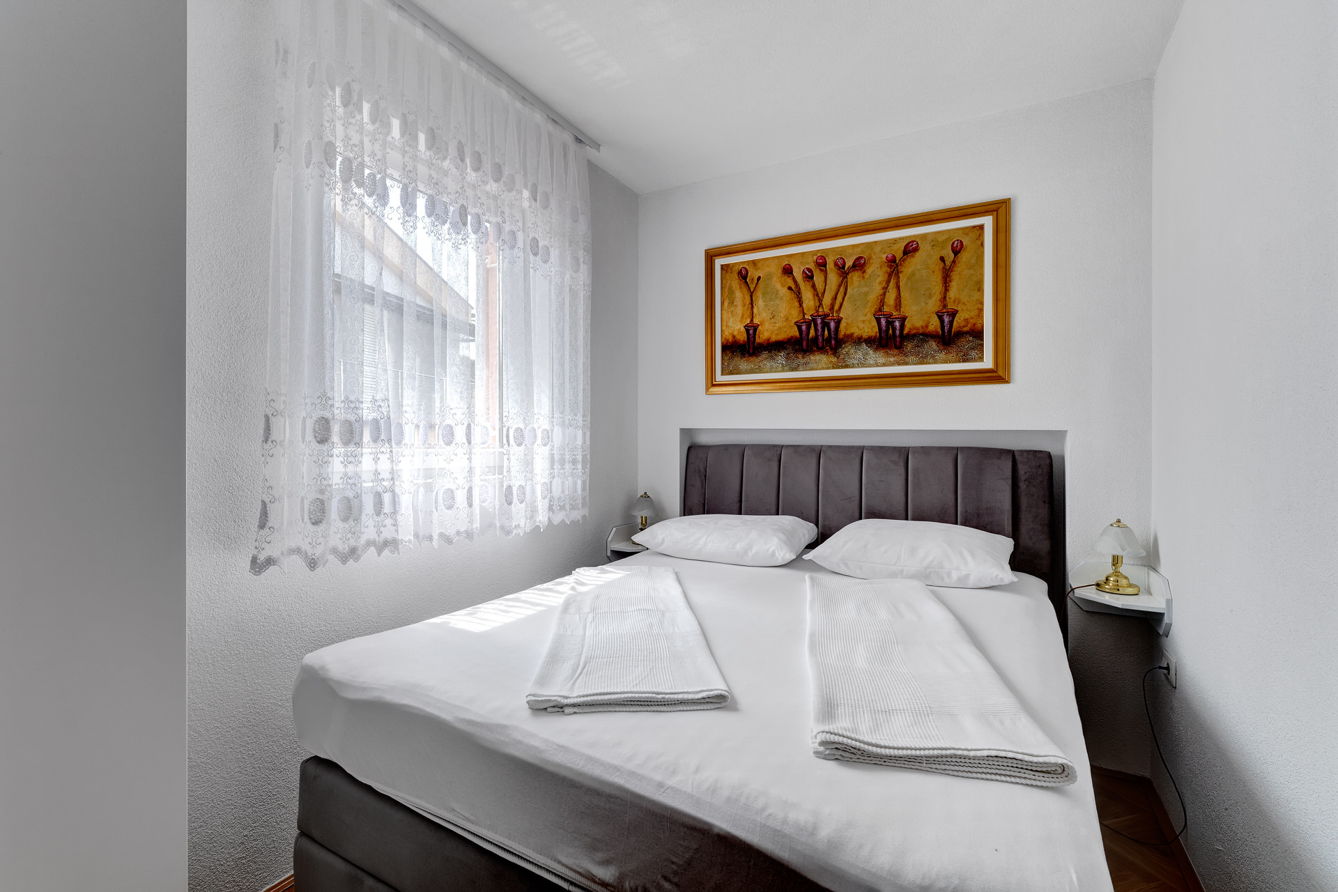 Za 4 osobe, veliki dnevni boravak, klima, lcd tv, dvije spavaće sobe, kupaona odvojena, izlazak na veliki vlastiti balkon sa pogledom na more.